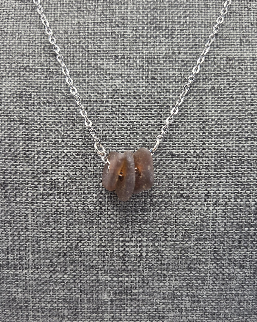 Three naturally formed square brown pieces found on the shores of Lake Erie. One piece at a time. Hung on an 18" stainless steel necklace.