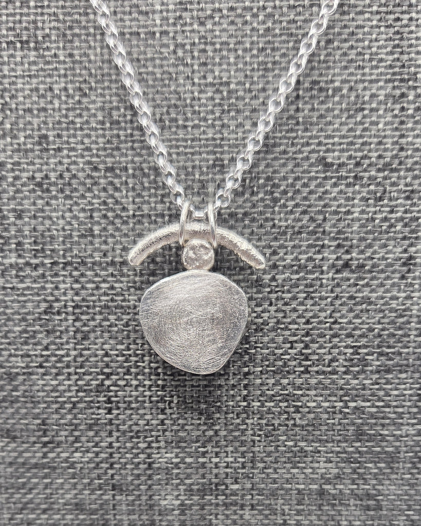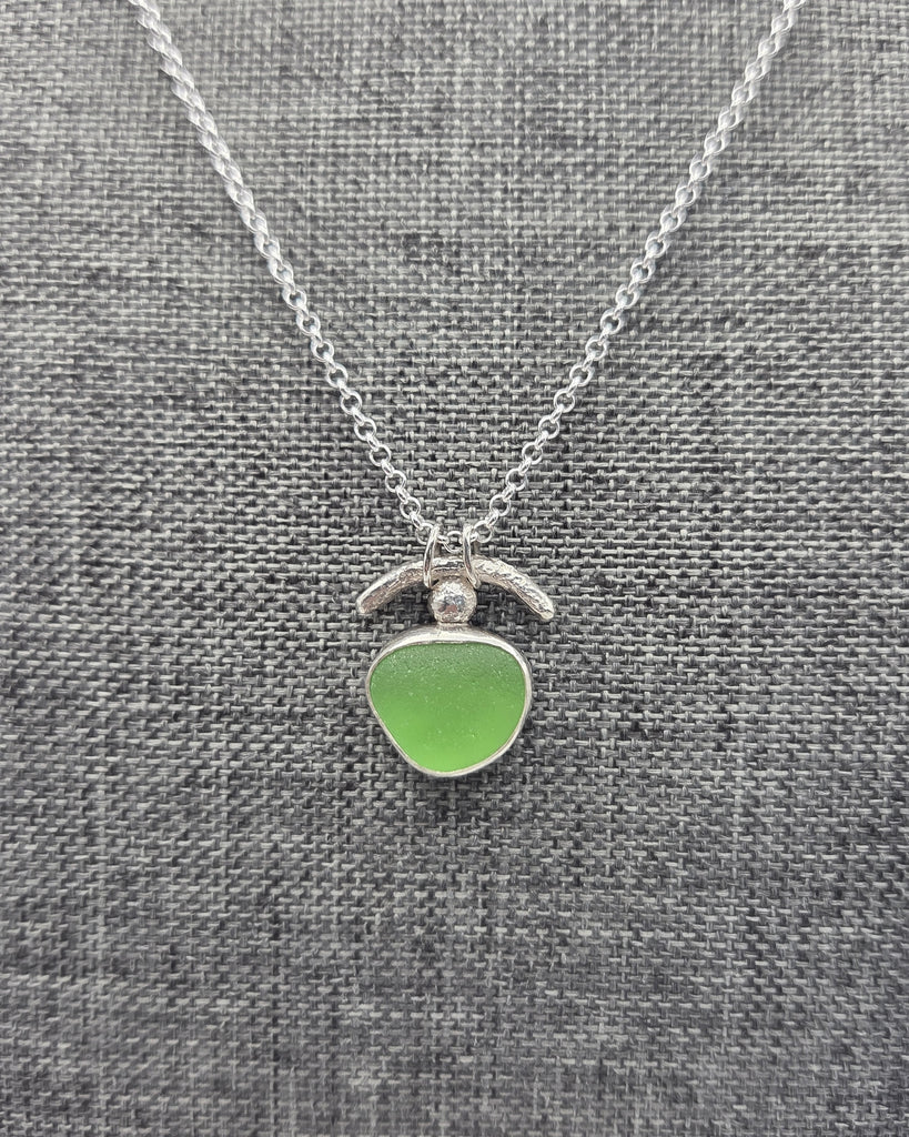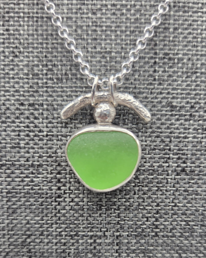 An almost symmetrical piece of Lake Erie beach glass with distressed sterling silver details. The sterling silver "rolo" chain is 18".