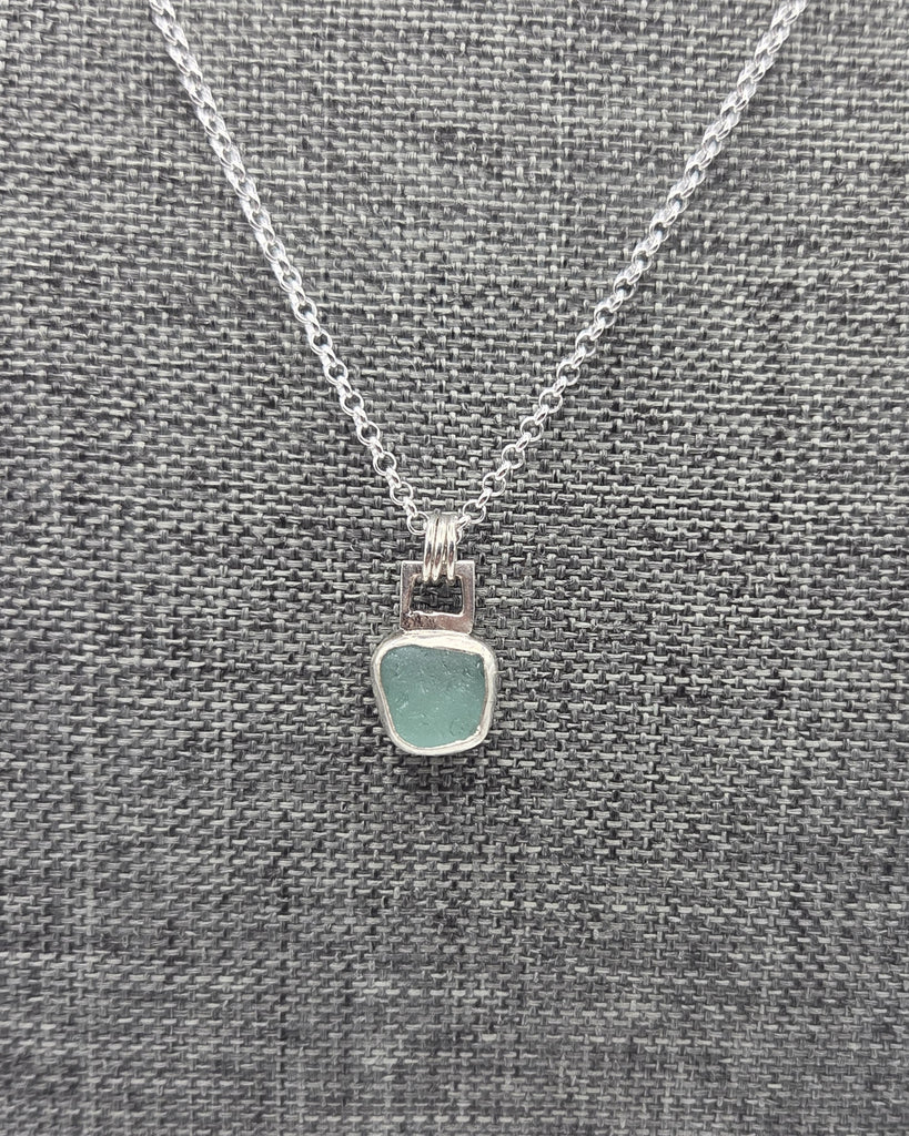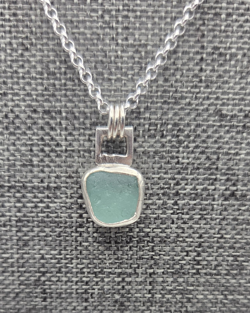 This sterling silver assemblage features aqua sea glass from Puerto Rico with an 18" chain.