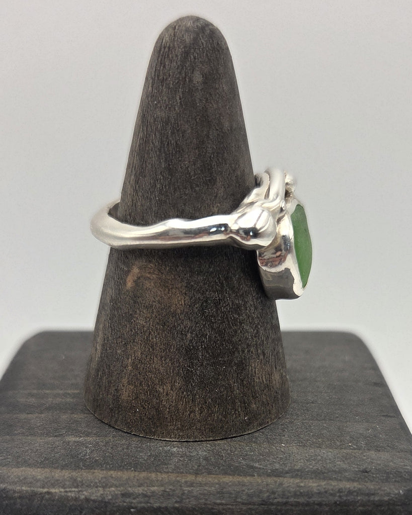 Sterling silver lapping against a green Cape Breton sea glass find. Size 7.