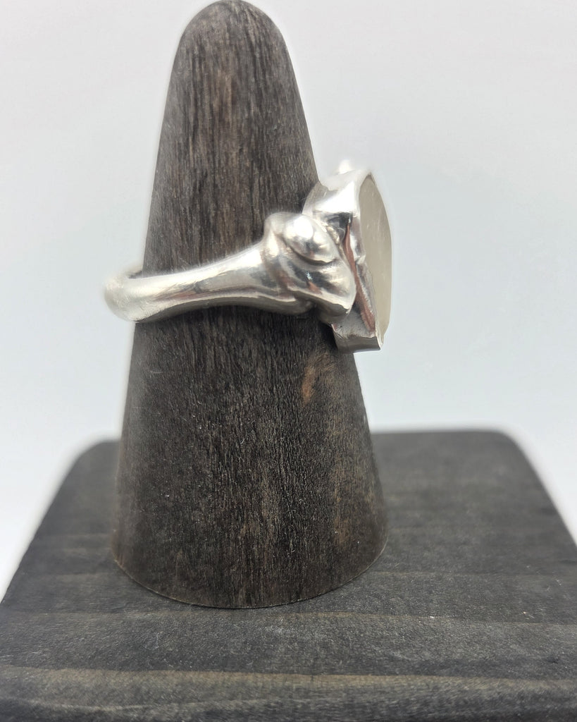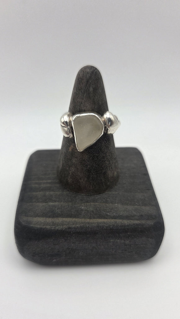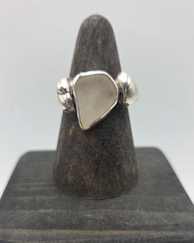 Formally clear and now frosted white by the ocean, this sea glass piece was found on Cape Breton's east coast. Clasped by sterling silver in size 6.
